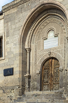 The crown gate of the madrasah, which had a rare splendor even at the time it was built, is a masterpiece among the stone carvings of the region. The double-winged wooden door features a plant relief, while its stone stepped arches, the pilasters and the entire wall surface are decorated with geometric reliefs.
